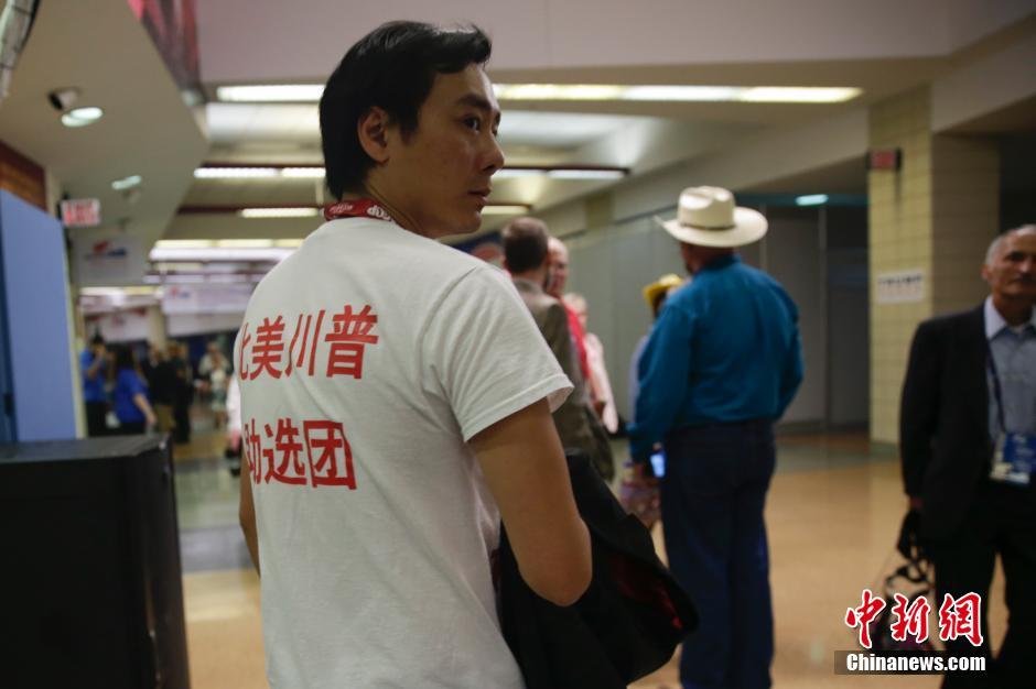 当地时间7月18日,美国共和党全国代表大会在俄亥俄州最大城市克利夫兰拉开帷幕,约5万名代表、党员和媒体参会。图为来自洛杉矶的特朗普支持者王湉参会。