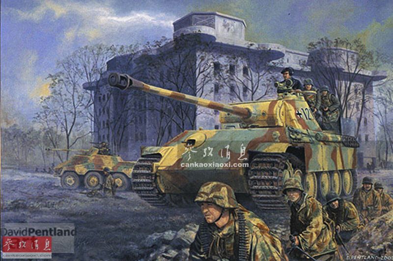 二战柏林战役期间,在动物园防空塔前警戒的德军“黑豹”坦克。