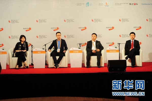 “慧眼中国环球论坛”2016年会于7月18日在新加坡开幕。图为企业家主题对话晚宴现场,嘉宾从左到右为“通商中国”总裁孙雪玲,阿里巴巴集团联合创始人兼资深副总裁、阿里巴巴新加坡董事总经理吴泳铭,阿里巴巴集团联合创始人兼资深副总裁、阿里巴巴新加坡总经理盛一飞,去哪儿网创始人兼前总裁、斑马资本董事总经理庄辰超。(胡石林摄)