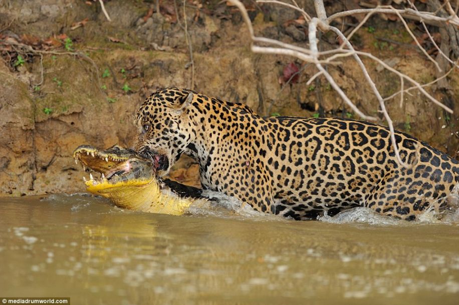 在彻底制服鳄鱼前,美洲豹和鳄鱼扭打成一团,并且咬住了鳄鱼的头部后方,这对于鳄鱼来说是致命的打击。