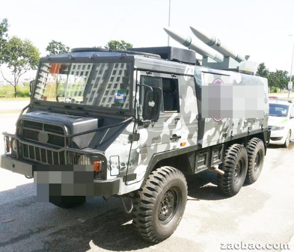 马来西亚雪兰莪一名商人购买军车并装成快餐车,但他没按规定清除迷彩,还在车顶加装两枚“导弹”,结果引起民众恐慌而报警。警方指军车买卖过程合法,但购买者必须清除迷彩,也不能加装“导弹”。