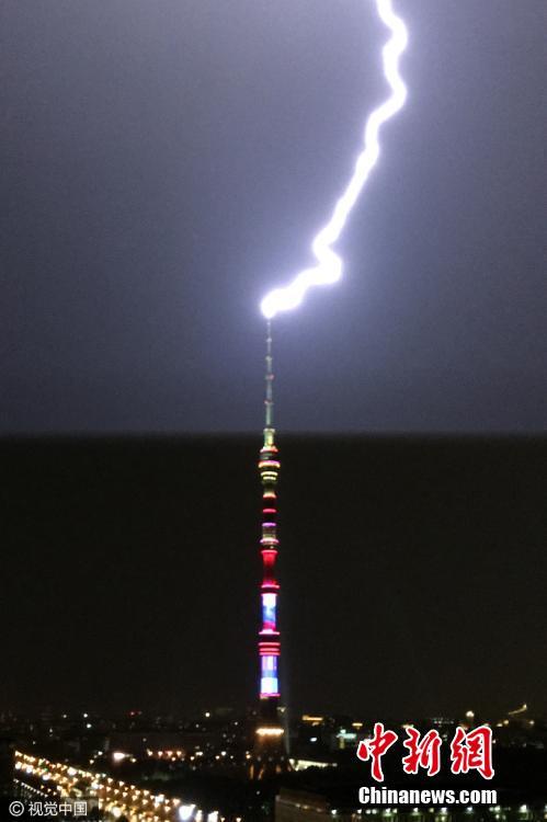 当地时间2016年7月19日,俄罗斯莫斯科,莫斯科Ostankino区上空电闪雷鸣,电视塔被闪电击中。图片来源:视觉中国