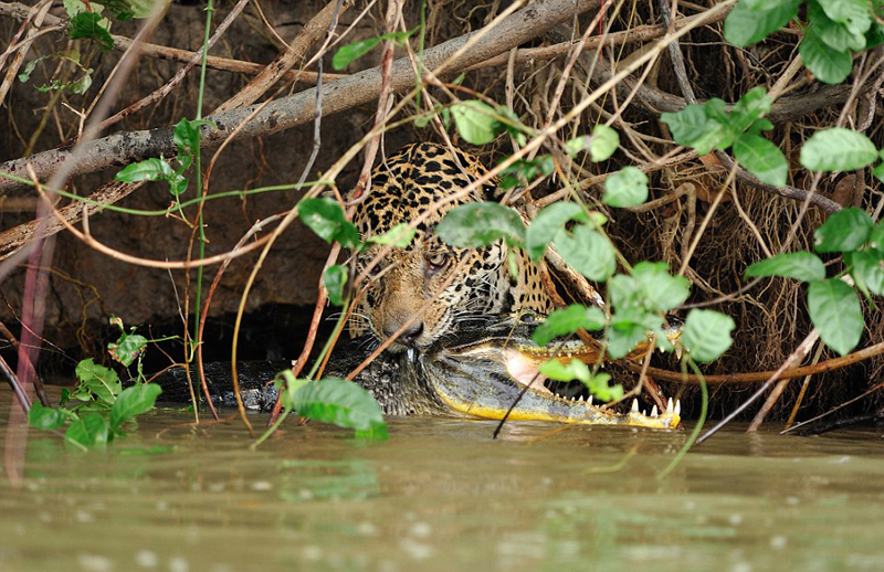 从拍摄的照片来看,这头美洲豹强壮有力,约重220磅(约合100公斤)。它原本只想在河边饮水降暑,可恰好有条未成年的小鳄鱼从旁游过,它便伺机猎杀。它先悄悄潜伏至一个合适的位置,之后突然对鳄鱼发起攻势。一番撕咬过后,美洲豹完全占了上风,对准鳄鱼头部发动致命一击,将鳄鱼变成了自己的盘中餐。