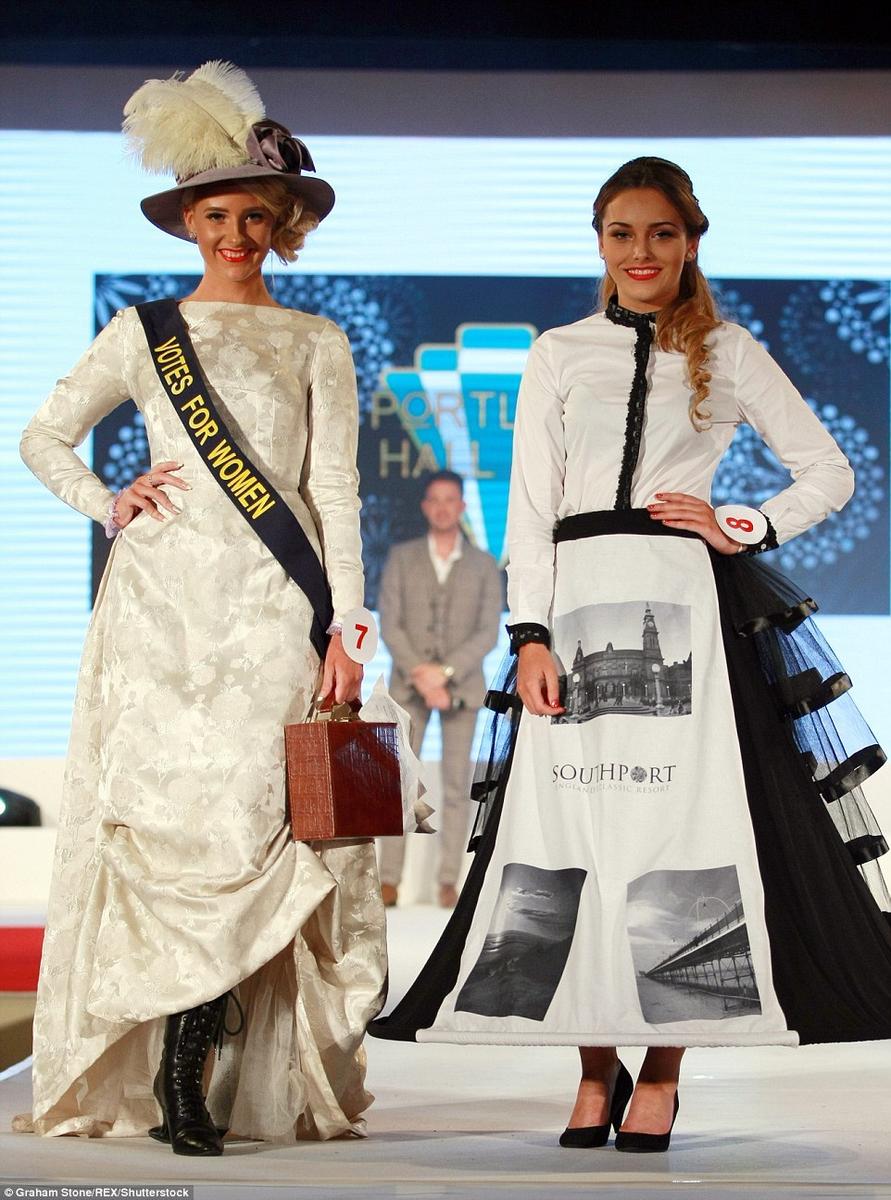 今年选美主题是“英国时尚服装的演变”,本图中左侧女子形象来自于妇女参政运动时期的女性装束。