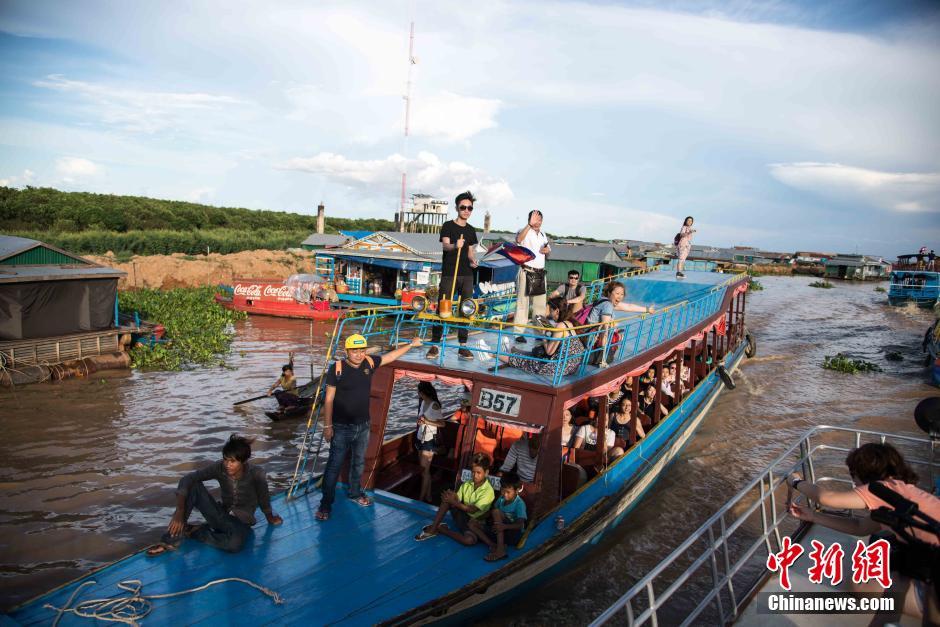 7月21日,位于柬埔寨的东南亚最大淡水湖——洞里萨湖迎来大量观看夕阳风光的外国游客。由于湄公河冲积物质带来的养份丰富,湖中盛产鱼虾,使得洞里萨湖成为柬埔寨北部的主要“肉食仓库”,湖的周围有三百万以上人民直接或间接地以渔业为生。洞里萨湖暹粒河口段因聚居“水上人家”而成为吸引外国观光客的景点。图为游客搭乘游船观光。中新社记者 洪坚鹏 摄