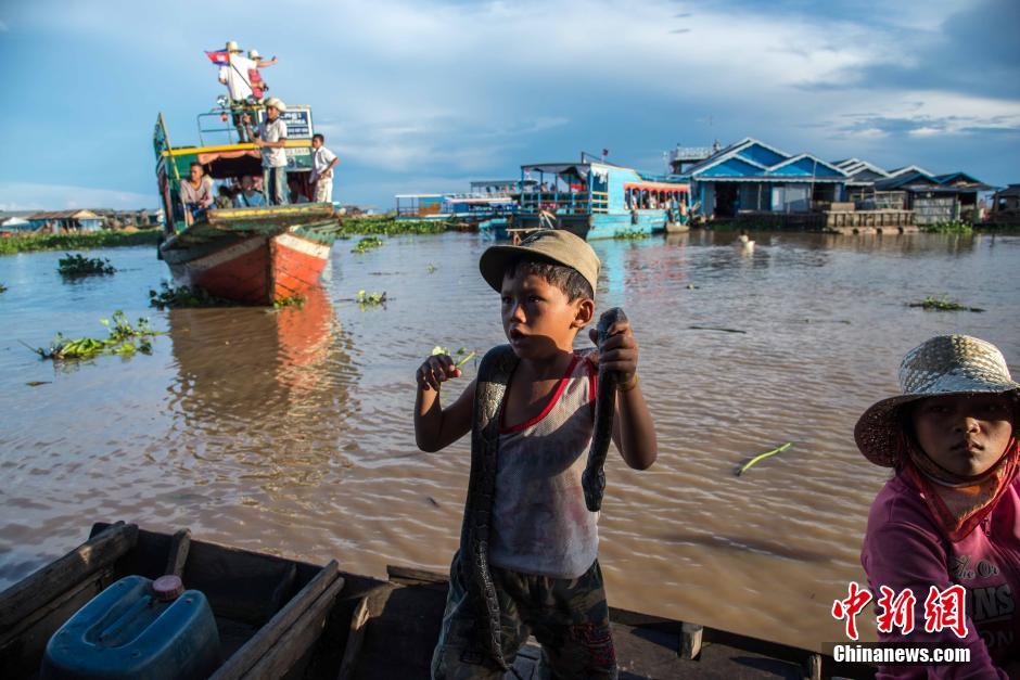 7月21日,位于柬埔寨的东南亚最大淡水湖——洞里萨湖迎来大量观看夕阳风光的外国游客。由于湄公河冲积物质带来的养份丰富,湖中盛产鱼虾,使得洞里萨湖成为柬埔寨北部的主要“肉食仓库”,湖的周围有三百万以上人民直接或间接地以渔业为生。洞里萨湖暹粒河口段因聚居“水上人家”而成为吸引外国观光客的景点。图为一名小男孩身披蟒蛇吸引游客拍照。中新社记者 洪坚鹏 摄