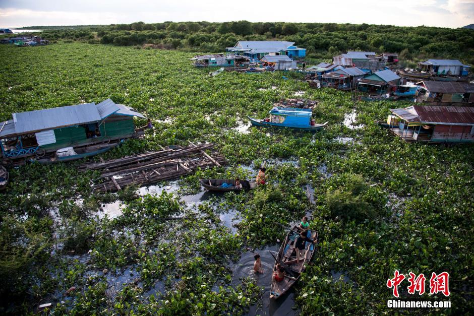 7月21日,位于柬埔寨的东南亚最大淡水湖——洞里萨湖迎来大量观看夕阳风光的外国游客。由于湄公河冲积物质带来的养份丰富,湖中盛产鱼虾,使得洞里萨湖成为柬埔寨北部的主要“肉食仓库”,湖的周围有三百万以上人民直接或间接地以渔业为生。洞里萨湖暹粒河口段因聚居“水上人家”而成为吸引外国观光客的景点。图为洞里萨湖的水上人家。中新社记者 洪坚鹏 摄
