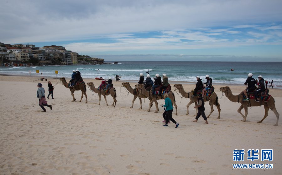 7月24日,悉尼,邦迪海滩上的骆驼。新华网发(朱宏业摄)