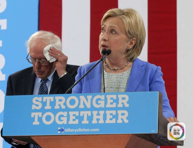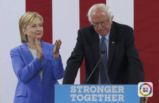民主党总统竞选人、参议员桑德斯2016年7月12日在竞选活动中表示支持竞选对手希拉里。(新华社/路透社)
