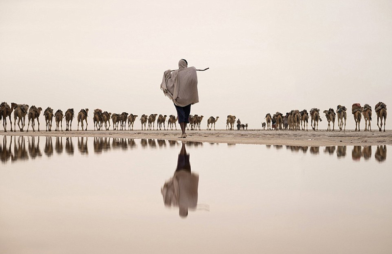图为在埃塞俄比亚,一群骆驼正被引到位于远处盐滩的采矿区。摄影师乔尔(Joel Santos)的这幅作品当选“水资源”组的第一名。