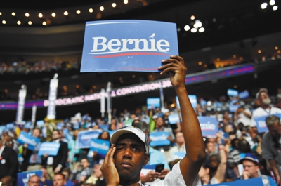 25日,民主党全国代表大会上,桑德斯发表演讲呼吁支持希拉里,不过台下他的支持者手持“伯尼”的牌子,眼含热泪对其不舍。