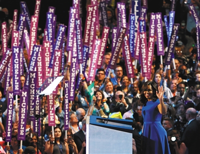 25日,民主党全国代表大会开幕,第一夫人米歇尔出场,观众手持印有“米歇尔”名字的标志牌,呼声热烈。