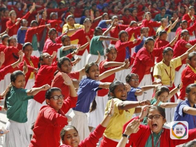 资料:2015年12月16日,印度艾哈迈达巴德,女学生集体练习防身术。(新华/路透)