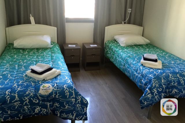 房间里有空调、电扇、沙发、茶几等家具家电,每张床上都铺着印有奥运项目图案的蓝色被子,床头柜上还摆放着国际奥委会明信片。不过与媒体村不同,或许是因为奥运村设有餐厅,这里并未像媒体村一样提供电热水壶、微波炉、冰箱等。