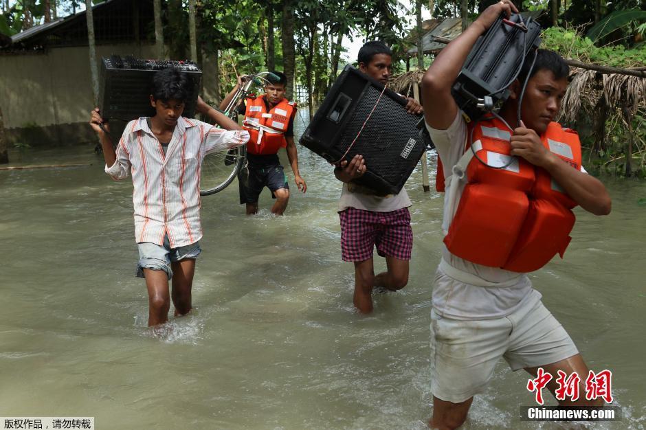 当地时间2016年7月27日,印度阿萨姆邦古瓦哈提,印度多地遭遇暴雨,导致布拉马普特拉河及其支流水位上涨,造成18个邦约120万人被迫离开家园。