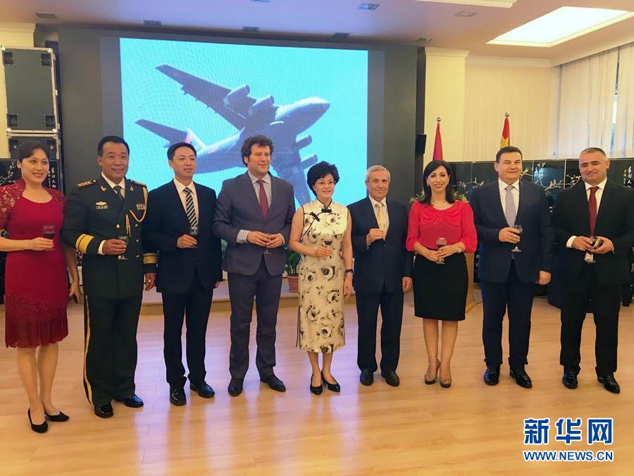 7月26日,中国驻阿尔巴尼亚大使馆举行庆祝中国人民解放军“八一”建军节招待会,庆祝中国人民解放军建军89周年。中国驻阿尔巴尼亚大使姜瑜(中)、武官刘兴江(左二)以及大使馆外交官出席。新华网记者刘力航摄