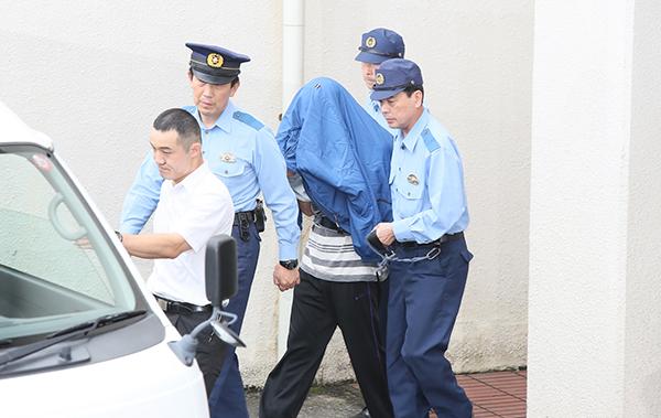 植松圣27日被带离警察局移送至神奈川县横滨市检方。他披着蓝色外套,在警方的看守下上了车。