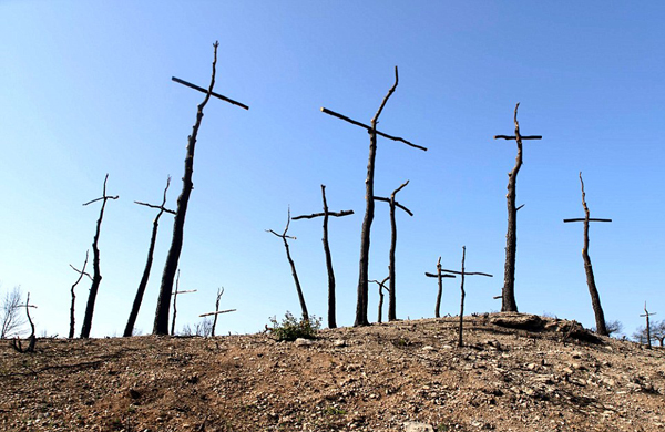 西班牙消防员制作上千十字架纪念被火灾烧毁森林(组图)