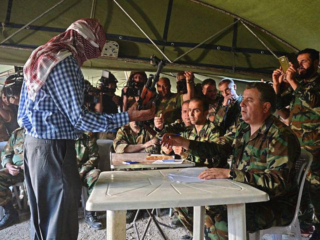 5月4日,哈马市附近,一名叙利亚前反对派武装人员将武器上缴给由叙利亚代表和俄罗斯军人组成的委员会。(图片来源:新华/法新)