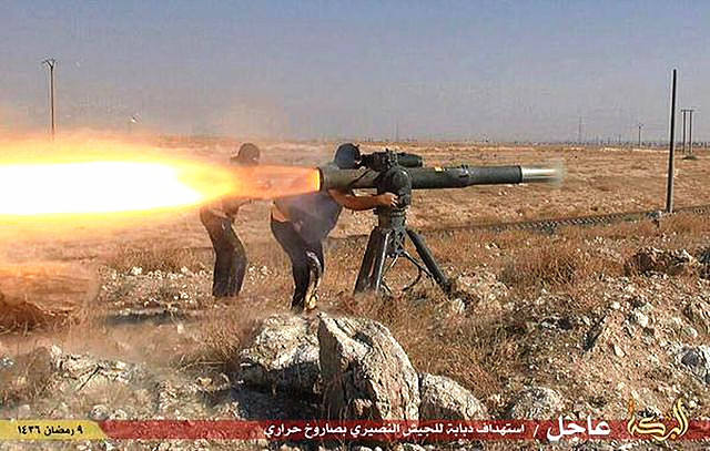 2015年6月26日上传互联网的照片显示“伊斯兰国”武装人员在叙利亚北部的战斗中向目标发射反坦克导弹。(图片来源:新华/美联)
