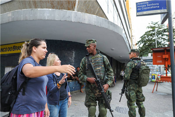 7月29日,安保人员在巴西里约热内卢科帕卡巴纳海滩附近街区为游客指路。新华社记者郑焕松摄