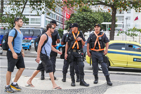 7月29日,安保人员在巴西里约热内卢科帕卡巴纳海滩附近执勤。新华社记者郑焕松摄