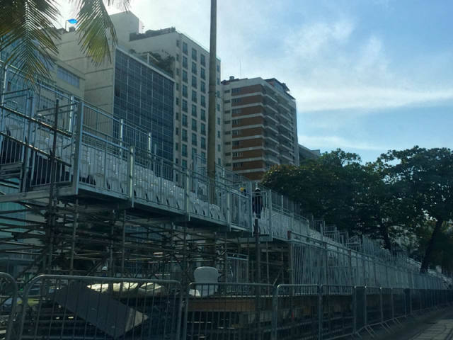 其实,瓜纳巴拉湾的确垃圾很多,但政府已经采取相应措施,放置了拦截网,改善后的环境已经得到了国际帆联等组织的认可。这是水域对面路边搭起的看台: