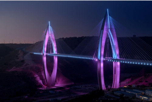 这座大桥横跨布里格里格(Bouregreg)河谷,全长950米,主塔高200米左右,其造型的设计灵感源自摩洛哥传统的拱形大门。
