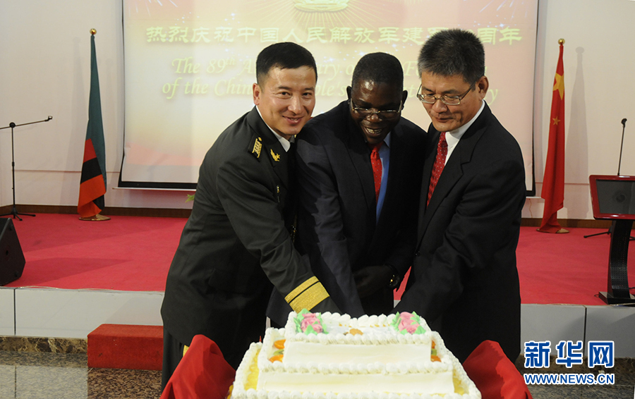 7月29日,中国驻赞比亚大使馆举行建军节招待会,隆重庆祝中国人民解放军建军89周年。中国驻赞比亚大使杨优明(右)、中国驻赞比亚大使馆武官孙明大校(左)、赞比亚国防部副部长克里斯托弗·穆伦加(中)及赞军队代表、各国驻赞使节、华人华侨代表等200余人出席招待会。新华网记者彭立军摄
