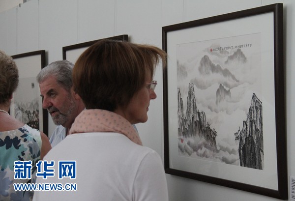 7月29日,德国女艺术家莫妮卡·霍费尔在德国巴伐利亚州赫希施泰特市城堡礼堂举办个人中国书法绘画展。图为观众欣赏中国水墨画。新华网记者朱晟摄