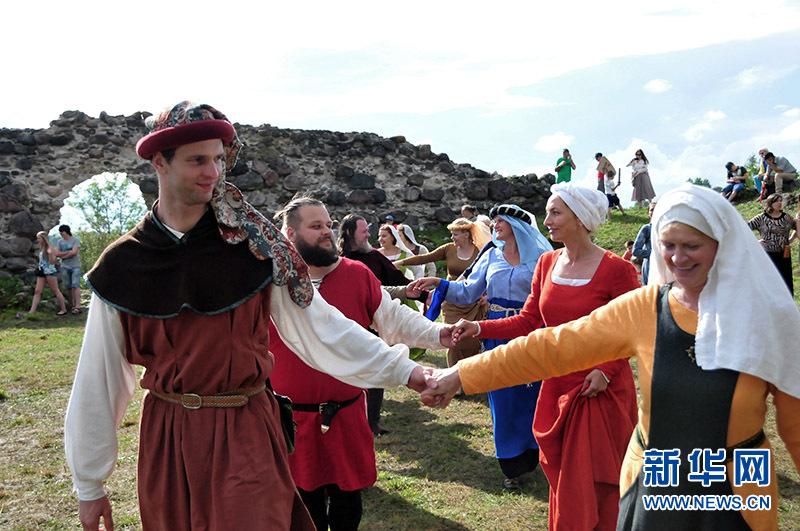7月30日,在拉脱维亚韦茨皮耶巴尔加古城堡,人们身着古装进行表演。当天,拉脱维亚第四届中世纪狂欢节在拥有650多年历史的韦茨皮耶巴尔加古城堡举行。穿戴盔甲在残垣断壁前打斗的“骑士”、铁匠铺燃烧的炉火、身着古装的男男女女,一道道场景让人们瞬间有了穿越的感觉,仿佛回到了几百年前的中世纪。新华网发(亚尼斯摄)