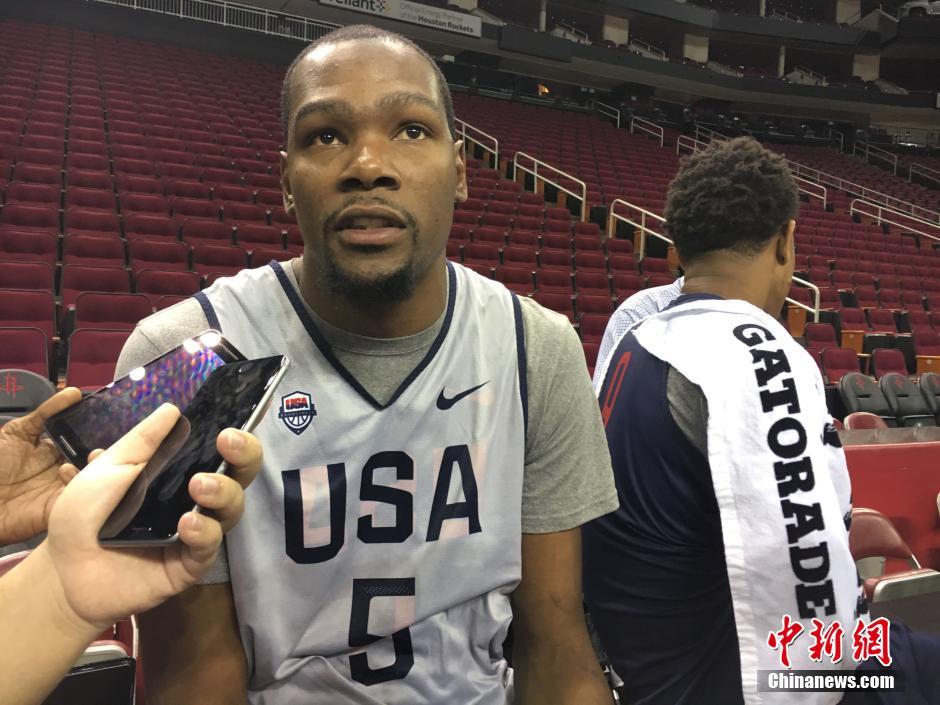 当地时间7月31日,被称为“梦之队”的美国男子篮球队在休斯敦集训,备战6天之后开战的2016年里约奥运会男篮比赛,这是美国男篮奥运开赛前的最后一站集中训练。图为上届奥运会美国男篮“得分王”杜兰特接受采访时强调,目前球员间磨合得非常好,是一支没有弱点的球队。 中新社记者 王欢 摄