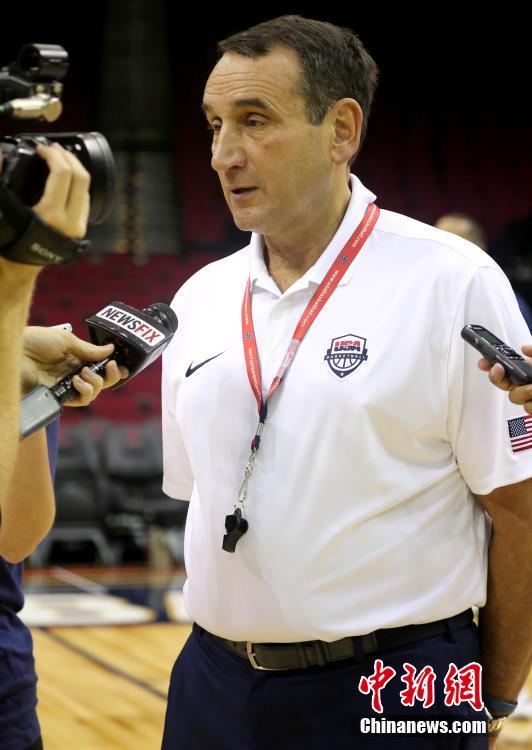 当地时间7月31日,被称为“梦之队”的美国男子篮球队在休斯敦集训,备战6天之后开战的2016年里约奥运会男篮比赛,这是美国男篮奥运开赛前的最后一站集中训练。图为美国男篮主教练迈克·沙舍夫斯基接受媒体采访。 中新社记者 王欢 摄