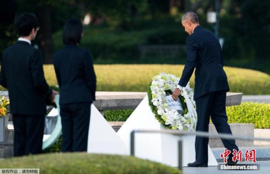 资料图:当地时间5月27日,美国总统奥巴马乘直升机抵达日本广岛和平纪念公园附近,展开对和平纪念公园的访问并献上花环。