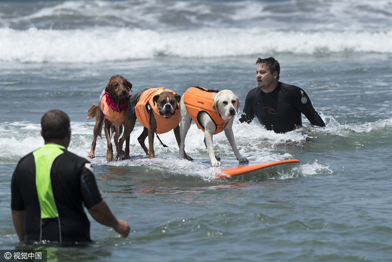 当地时间2016年7月30日,美国加州因皮里尔海滩,65只狗狗参加当地一年一度的冲浪比赛,该活动为圣地亚哥人道主义协会筹款。CFP