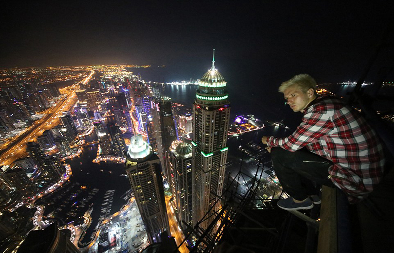照片中,职业跑酷运动员阿布迪正在迪拜世界贸易中心大楼顶上自拍;俄罗斯跑酷高手奥列格(Oleg Sherstyachenko)正坐在迪拜第二高建筑——1394英尺(约425米)高的马里纳101大楼顶上俯瞰迪拜夜景。在红牛电视发布会上,奥列格表示,他想感受“恐惧”是什么感觉,而这张照片只是他的一个尝试。