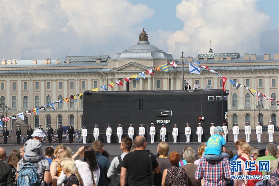 7月31日,人们在俄罗斯圣彼得堡涅瓦河畔观看接受检阅的“克拉斯诺达尔”号柴电动力潜艇。