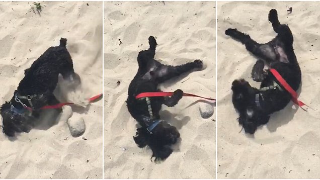 对于大多数人而言,儿时第一次在海边玩耍的经历尤为难忘,对于狗狗来说也是一样,视频中小狗不能自已的激动表现就是最好的证明。虽然被主人牵着,兴奋的小狗还是四脚朝天地躺在沙滩上肆意扭动着身体。