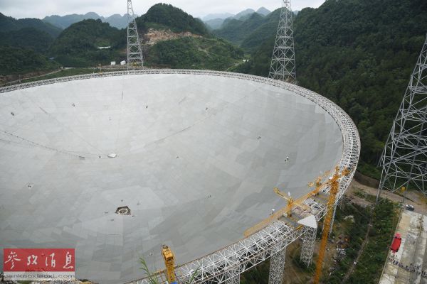 7月3日,世界最大单口径射电望远镜FAST主体工程完工。据介绍,FAST突破了射电望远镜的百米极限,它拥有30个足球场大的接收面积,与号称“地面最大的机器”的德国波恩100米望远镜相比,灵敏度提高约10倍。它将在未来10至20年保持世界一流设备的地位。新华社记者 刘续 摄