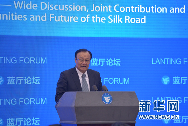 第十七届“蓝厅论坛”3日在外交部蓝厅举行,主题为“第五届中国—亚欧博览会——共商共建共享 丝路:机遇与未来”。图为新疆维吾尔自治区主席雪克来提·扎克尔发表主旨演讲。新华网 郭小天 摄