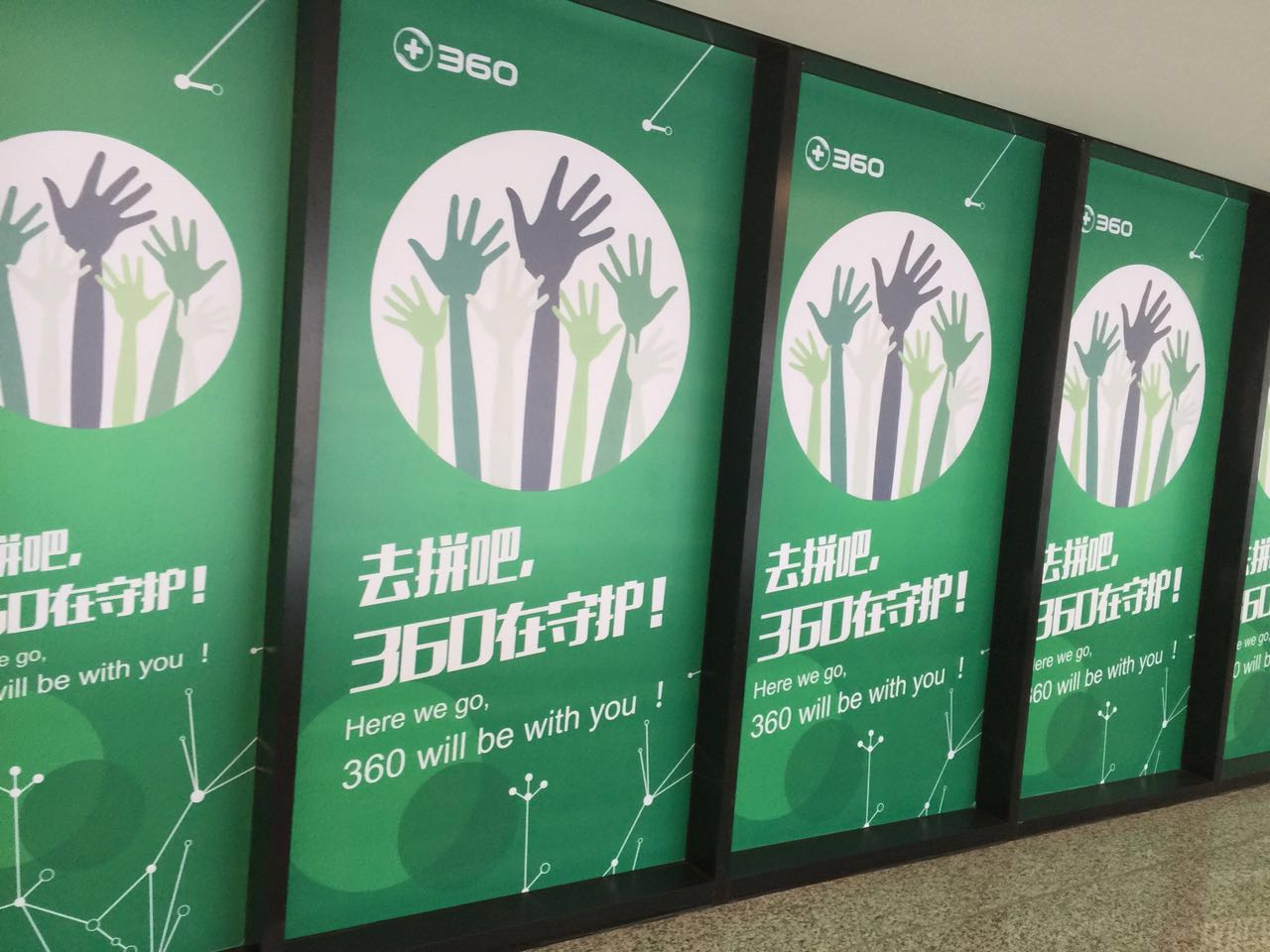 在通过海关的路上,两侧墙壁不时出现奥运宣传画,右手一堵墙上赫然发现了361°的“弟弟”——360,宣传语是“去拼吧,360在守护”。临行前,360为来巴西观战奥运的中国客人提供1000个“奥运锦囊”,包含移动WiFi及清凉油等物件,“守护”这两个字还真有现实意义。