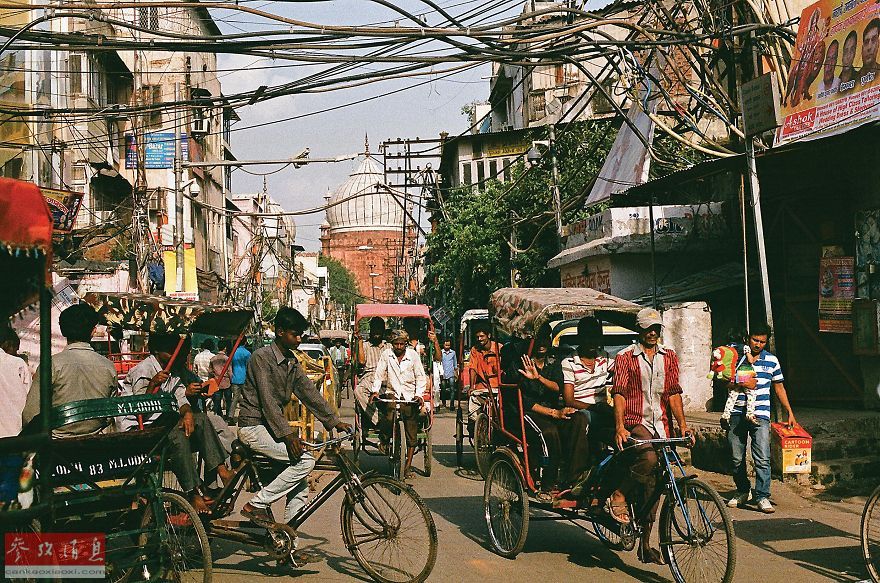 在德里拥挤的大街上全是人力车。在印度,所有适龄儿童都必须强制入学接受教育。但是并不需要支付任何费用。学校方面还提供免费的午餐。而且这个免费教育的范围是从幼儿园到大学,为了鼓励一些外来移民和印度的少数民族入读普通的学校以融入印度社会,政府还对此有补贴。