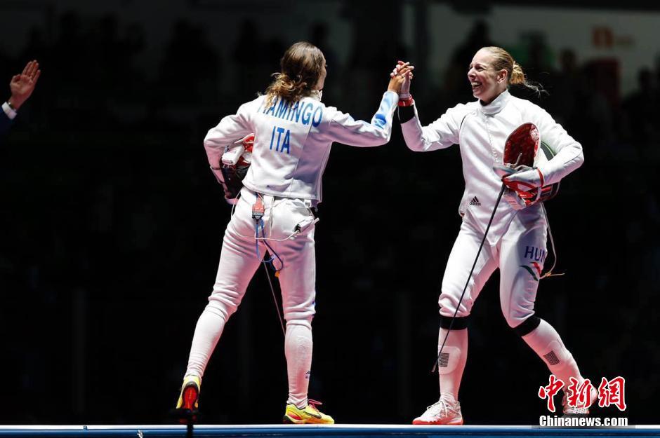 当地时间8月6日,里约奥运会女子重剑个人决赛,匈牙利选手斯扎兹15-13战胜意大利选手费艾米古,夺得金牌。中新网记者 盛佳鹏 摄