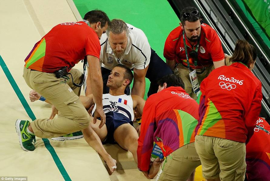 法国跳马运动员落地骨折 小腿90度弯曲(图)
