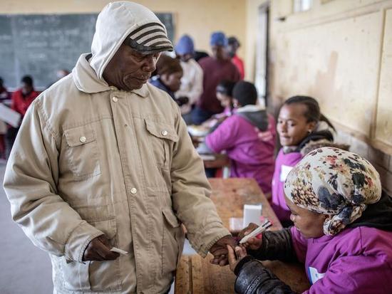 8月3日,约翰内斯堡,投票前,选举工作人员在投票者手指上画上标记。(图片来源:新华/法新)