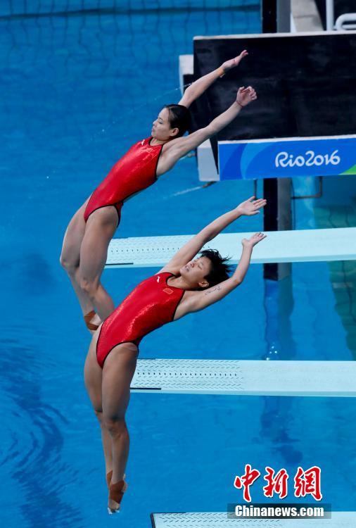 当地时间8月7日,在里约奥运会女子双人三米板决赛中,中国选手吴敏霞/施廷懋一路领先,无悬念夺得桂冠。这是吴敏霞在奥运会跳水项目上的个人第五金,而5金1银1铜的成绩也让她超越了萨乌丁、伏明霞、郭晶晶等名将,成为奥运会跳水项目第一人,为自己的跳水生涯画上圆满句号。图为吴敏霞和施廷懋在比赛中。中新网记者 杜洋 摄