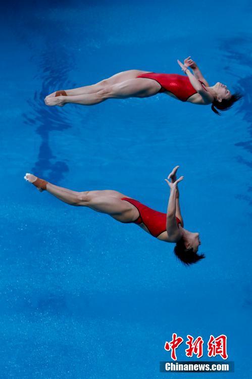 当地时间8月7日,在里约奥运会女子双人三米板决赛中,中国选手吴敏霞/施廷懋一路领先,无悬念夺得桂冠。这是吴敏霞在奥运会跳水项目上的个人第五金,而5金1银1铜的成绩也让她超越了萨乌丁、伏明霞、郭晶晶等名将,成为奥运会跳水项目第一人,为自己的跳水生涯画上圆满句号。图为吴敏霞和施廷懋在比赛中。中新网记者 杜洋 摄