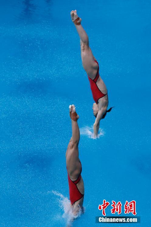 当地时间8月7日,在里约奥运会女子双人三米板决赛中,中国选手吴敏霞/施廷懋一路领先,无悬念夺得桂冠。这是吴敏霞在奥运会跳水项目上的个人第五金,而5金1银1铜的成绩也让她超越了萨乌丁、伏明霞、郭晶晶等名将,成为奥运会跳水项目第一人,为自己的跳水生涯画上圆满句号。图为吴敏霞和施廷懋在比赛中。中新网记者 杜洋 摄