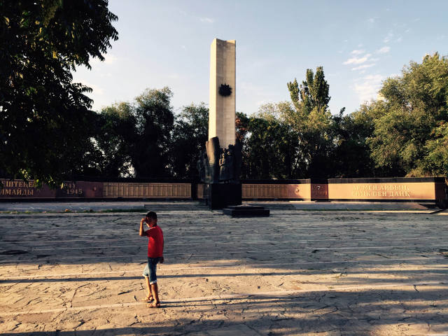 图为一名儿童走过扎尔肯特卫国战争胜利纪念碑