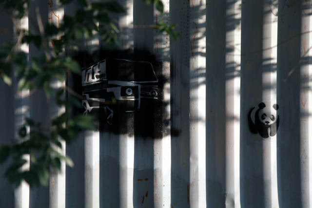 图为当地一家私人小院的围栏,看来,主人有越野情怀,还青睐中国的熊猫
